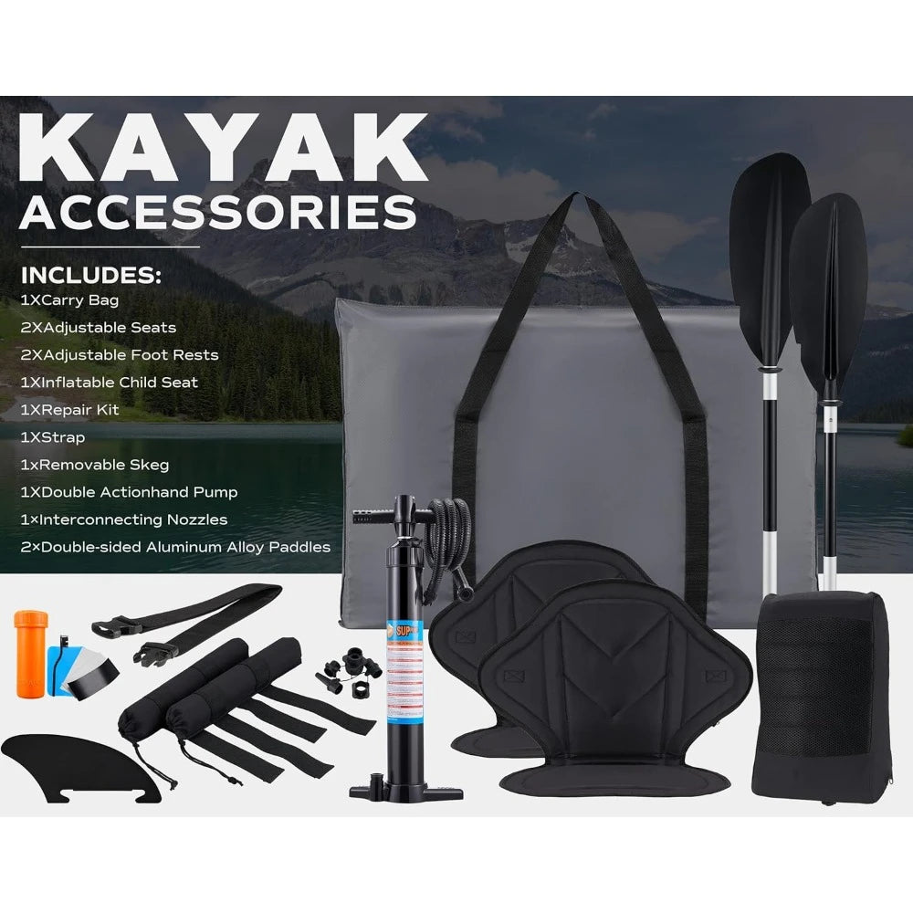 - Full Accessories Included–inflatable kayak package has everything you need to enjoy your day on the water, including 2 Adjustable Seats, 2 Adjustable Foot Rests, a Inflatable Child Seat (or dog), 2 Double-sided Aluminum Alloy Paddles, Double Actionhand Pump, Repair Kit, Strap, Carry Bag and Removable Skeg