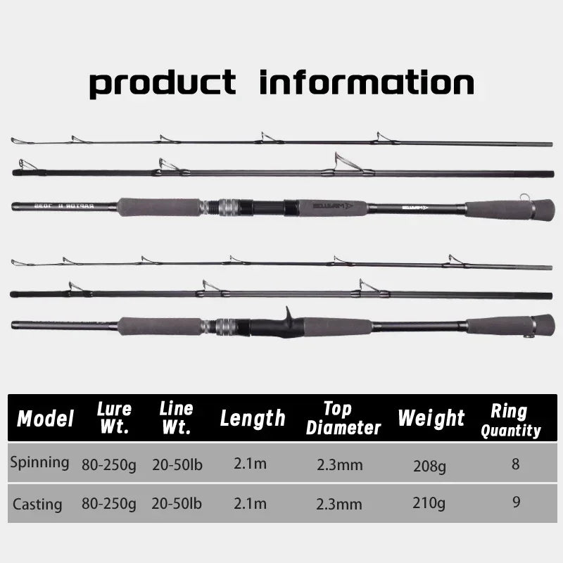 Legnth: 2.1m|Weight: 210g|Lure Weight : 80-250g|Line Weight: 20-50lb|Action : Fast |Power : MH|Top Diameter : 2.3mm|Section: 3|