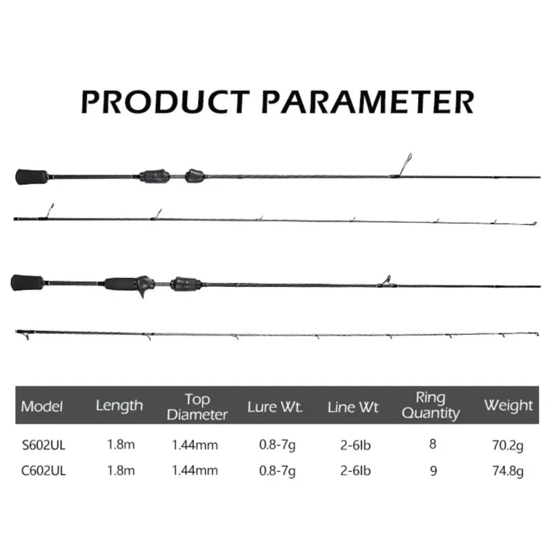 Length: 1.8m | Closed Length: 94.3cm |Weight: 70.2g | Section: 2 | Top Diameter: 1.44mm | Lure Weight: 0.8-7g
