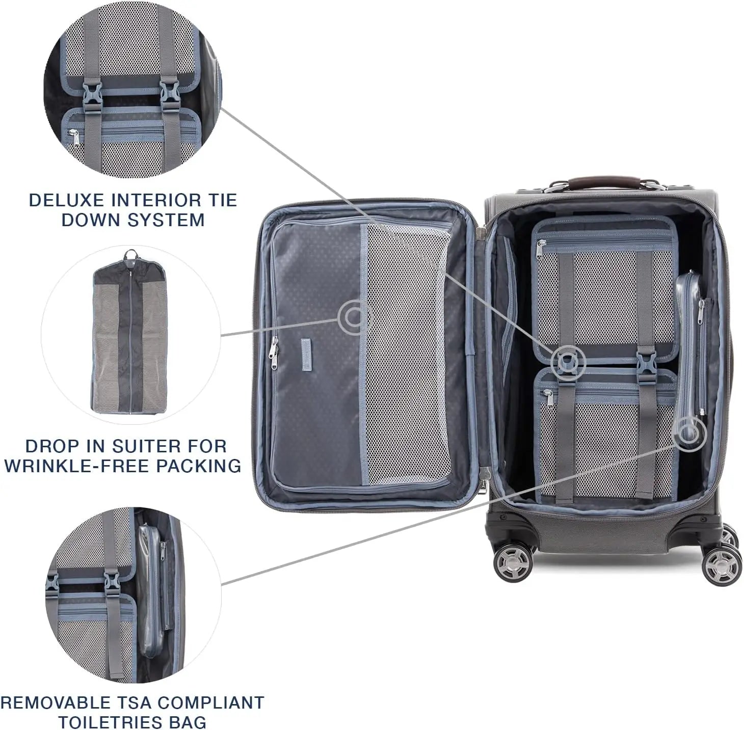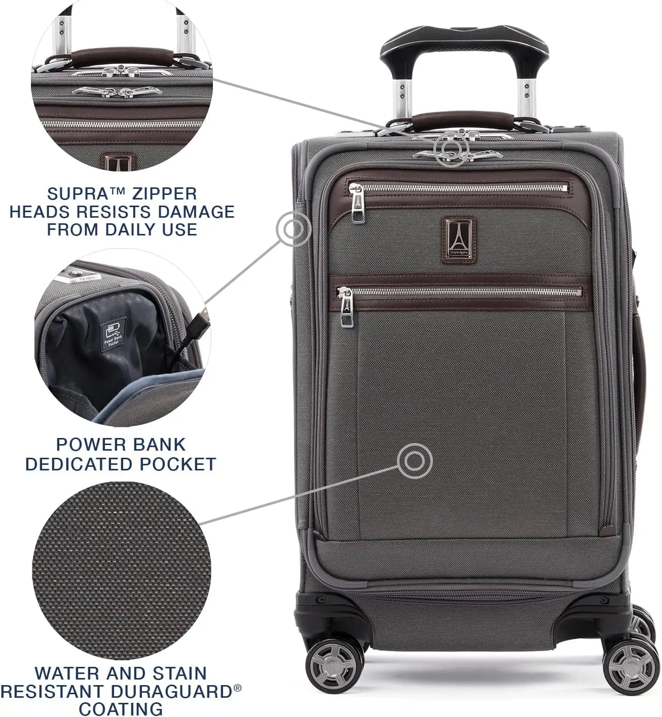 Maximize your carry-on with sophisticated style. The Platinum Elite 21" Expandable Carry-on spinner delivers big on form and function with a tip-resistant expansion that offers up to 2" more packing capacity, deluxe tie-down system, integrated accessory pockets and a removable quart-size wet pocket that is TSA compliant and perfect for toiletries. Plus, the drop-in, Fold-out suiter is specifically designed to accommodate hanging clothes and prevent wrinkling. Built-in USB port lets you power up on the go, while a dedicated powerbank pocket for your back-up battery adheres to FAA regulations. Perfect for short to medium-length trips, this carry-on spinner is crafted in style with premium fabrics, genuine leather and chrome zippers. Top-of-the-line mobility features include the precision glide system with eight magnatrac, self-aligning, 360-degree spinner wheels guided by an adjustable PowerScope extension handle with patented Contour grip and rubberized touch points for comfortable, easy maneuvering wherever you go. Backed by our built for a lifetime limited worry free warranty that covers the cost of repair for damage from airline or other common carrier for the life of the bag after registration under the trusted companion promise.