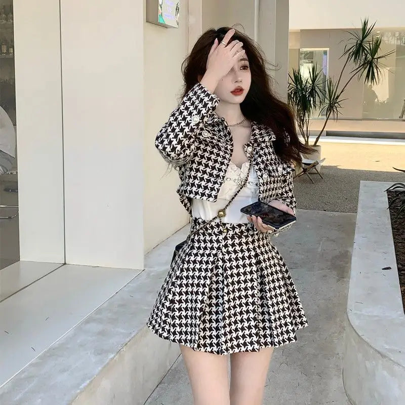 Small Fragrance Style Elegant Tweed 2 Piece Set Women Vintage Houndstooth Cropped Jacket + Pleated Mini Skirt Suits Sexy Outfits