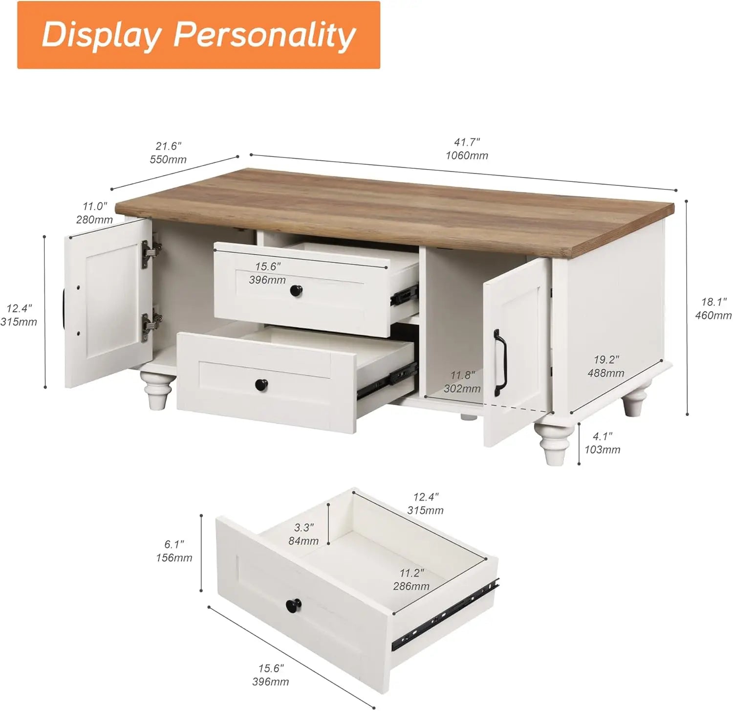 - 【Stable and Durable Structure】Made from thickened premium P2 MDF, the farmhouse coffee table offers long life span to you. Plus, gourd-shaped solid wood legs make sure the stability of the coffee table for living room. The rounded table edge prevents accidental bruises. Weight Capacity of Tabletop: 88 lbs. Weight Capacity of Drawer: 11 lbs.