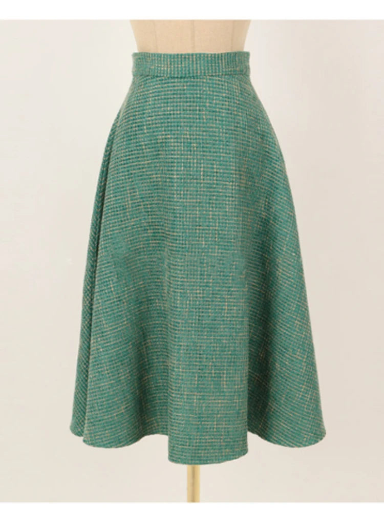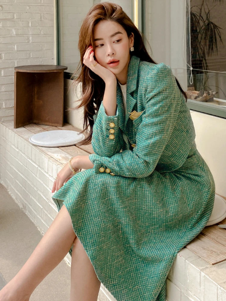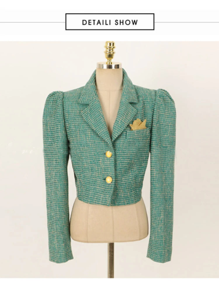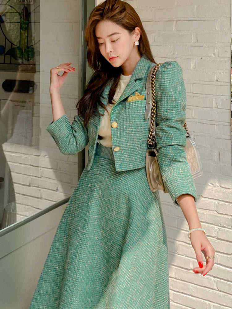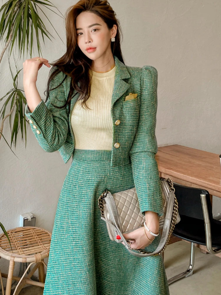 Women Two piece Set Korean Chic French Temperament V-neck Pearl Button Puff Sleeve Short Jacket + High Waist Swing Skirt Suits