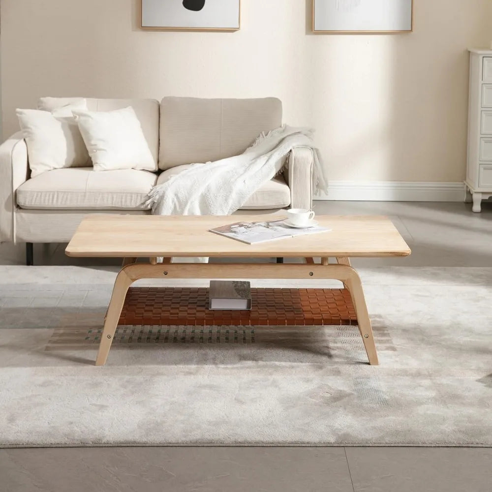 Wood Coffee Table for Living Room, 2-Tier Coffee Table with Open Storage Shelf, Mid Century Modern Rectangular Center Table,